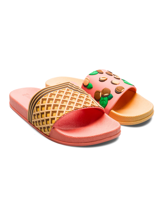 Explore quality beach footwear – slides. They are stylish, comfortable, and made of tested, safe PVC. Refresh your summer with their juicy themes.